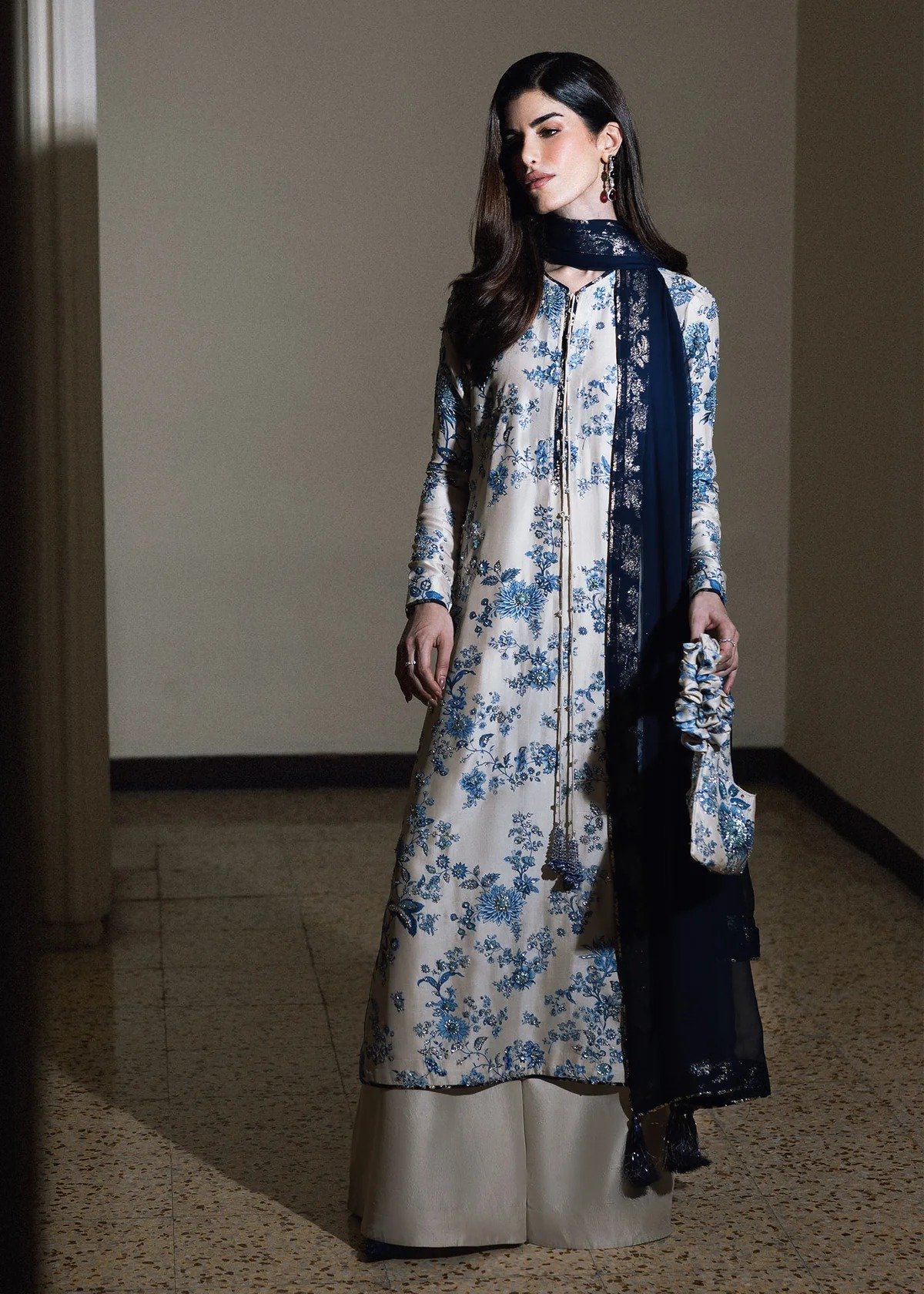 This elegant ensemble features a classic ivory and navy blue color palette, combining intricate floral patterns with modern tailoring. The long, straight-cut kameez is crafted from a lustrous ivory silk-blend fabric, entirely covered in an intricate blue floral print reminiscent of traditional porcelain. The neckline is designed with a small split-round opening, accented by long, thin drawstrings that terminate in decorative navy tassels. For the bottoms, the shirt is paired with voluminous, wide-leg palazzo trousers in a solid ivory silk that provides a clean, fluid contrast to the busy print of the top. A deep navy sheer dupatta, likely made of chiffon or organza, is draped over the shoulder and features matching blue and silver facing along its borders.